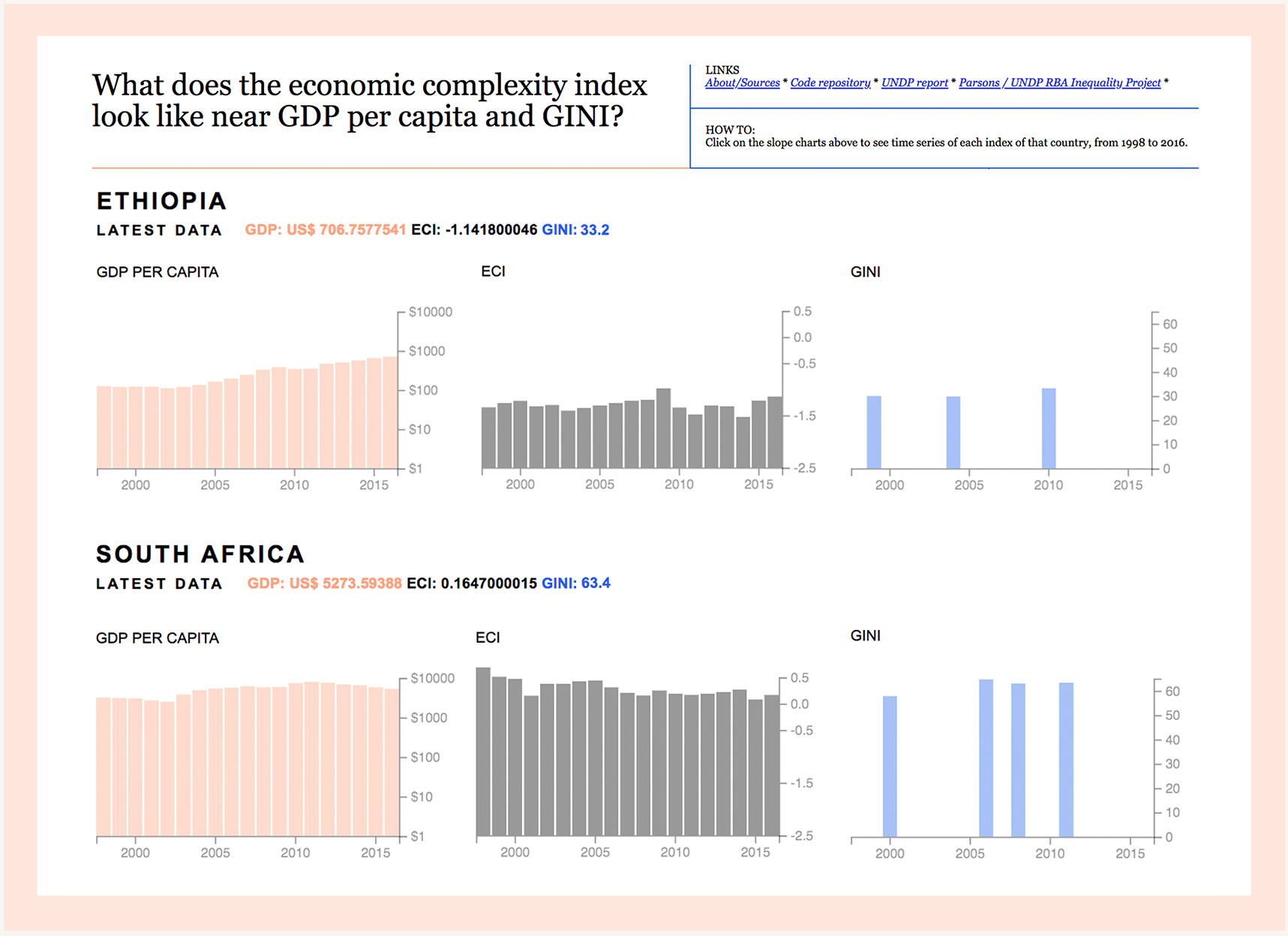 The visualization has two features: it uses a slopegraph to see how the GDP per capita, ECI and GINI are connected in a country. It also shows, as a secondary feature, the time series for each of of those indexes for the Country selected.