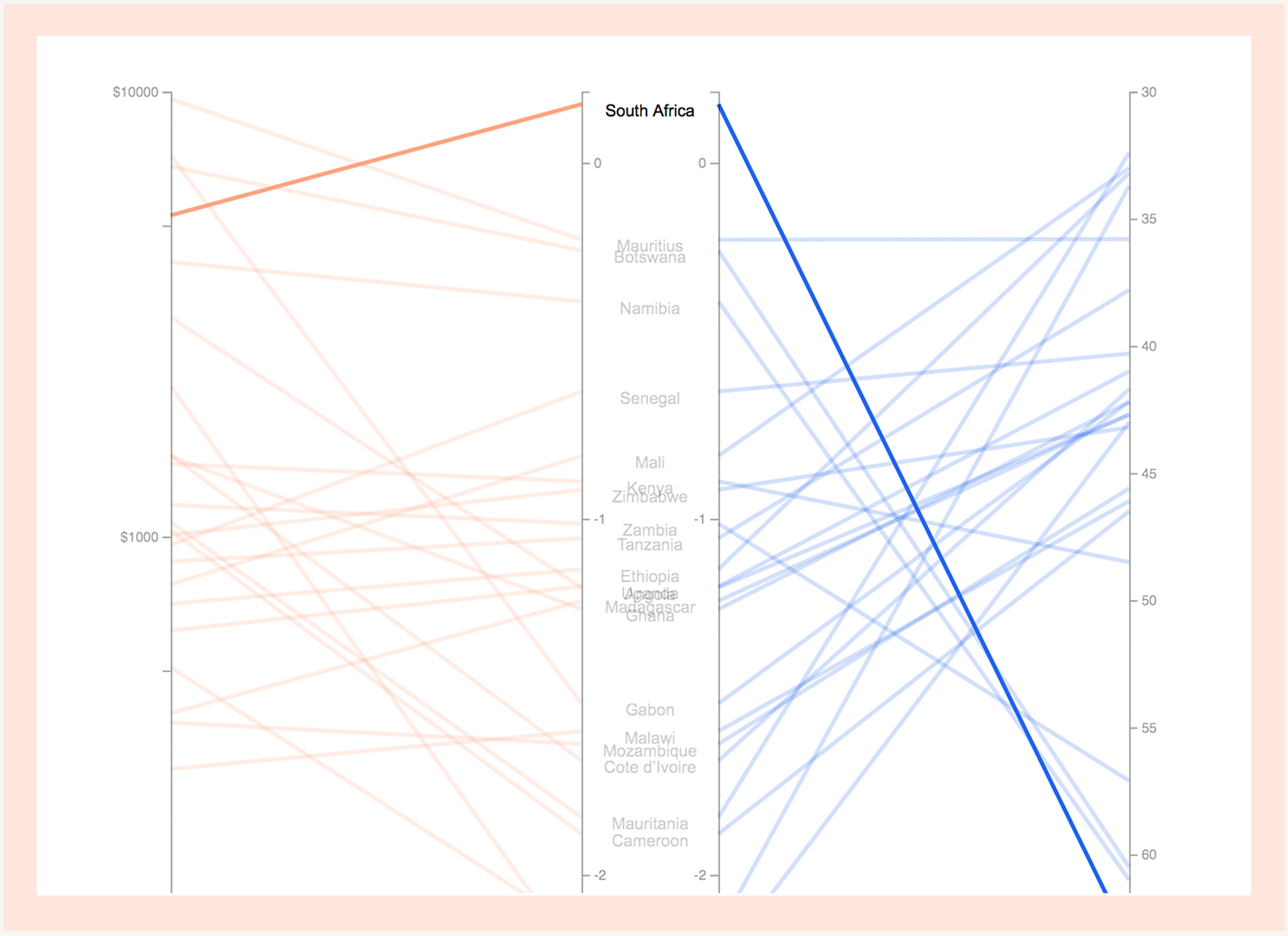 The slopegraph has 3 steps; 1st, the GDP per capita; 2nd, the ECI; 3rd, GINI. The vertical position of the corners of each line was normalized to the axis height.