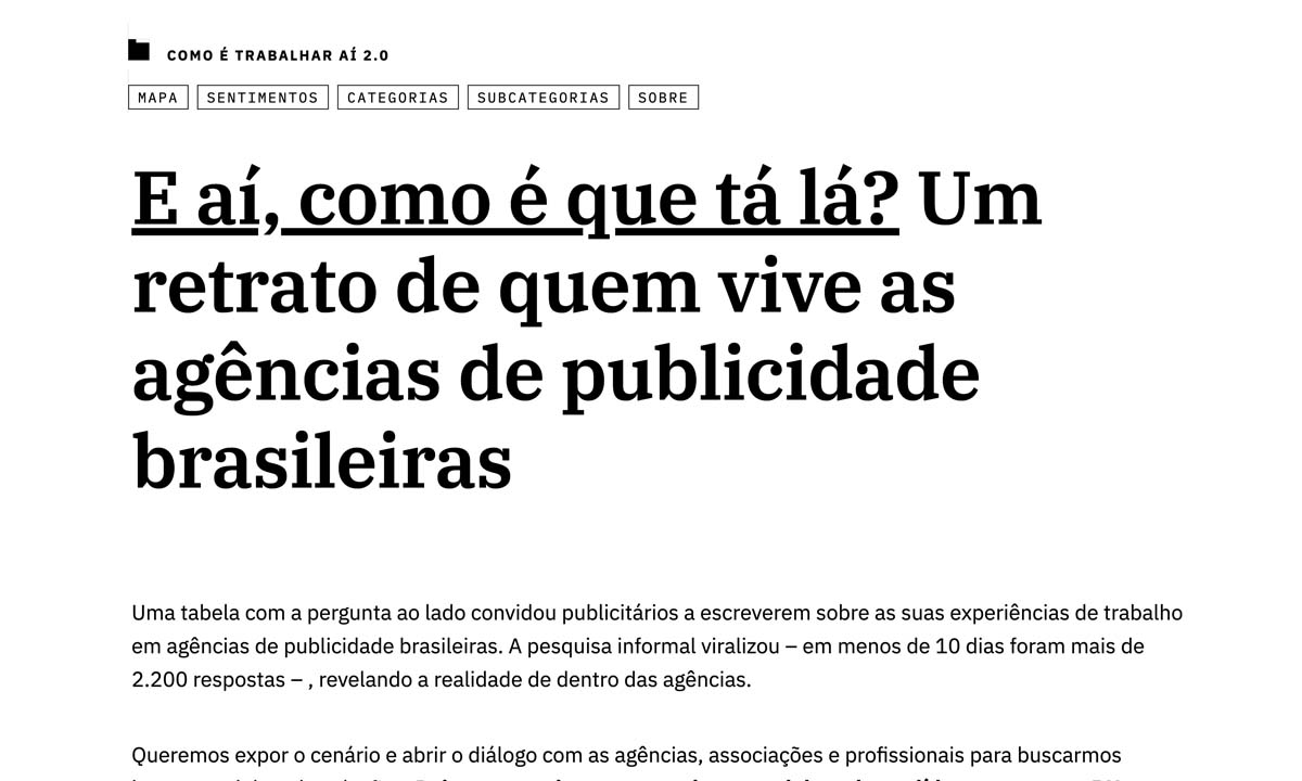 A spreadsheet with the question above invited ad people to write about their work experiences in Brazilian advertising agencies. The informal survey went viral — in less than 10 days, there were more than 2,200 responses — revealing the reality inside the agencies.