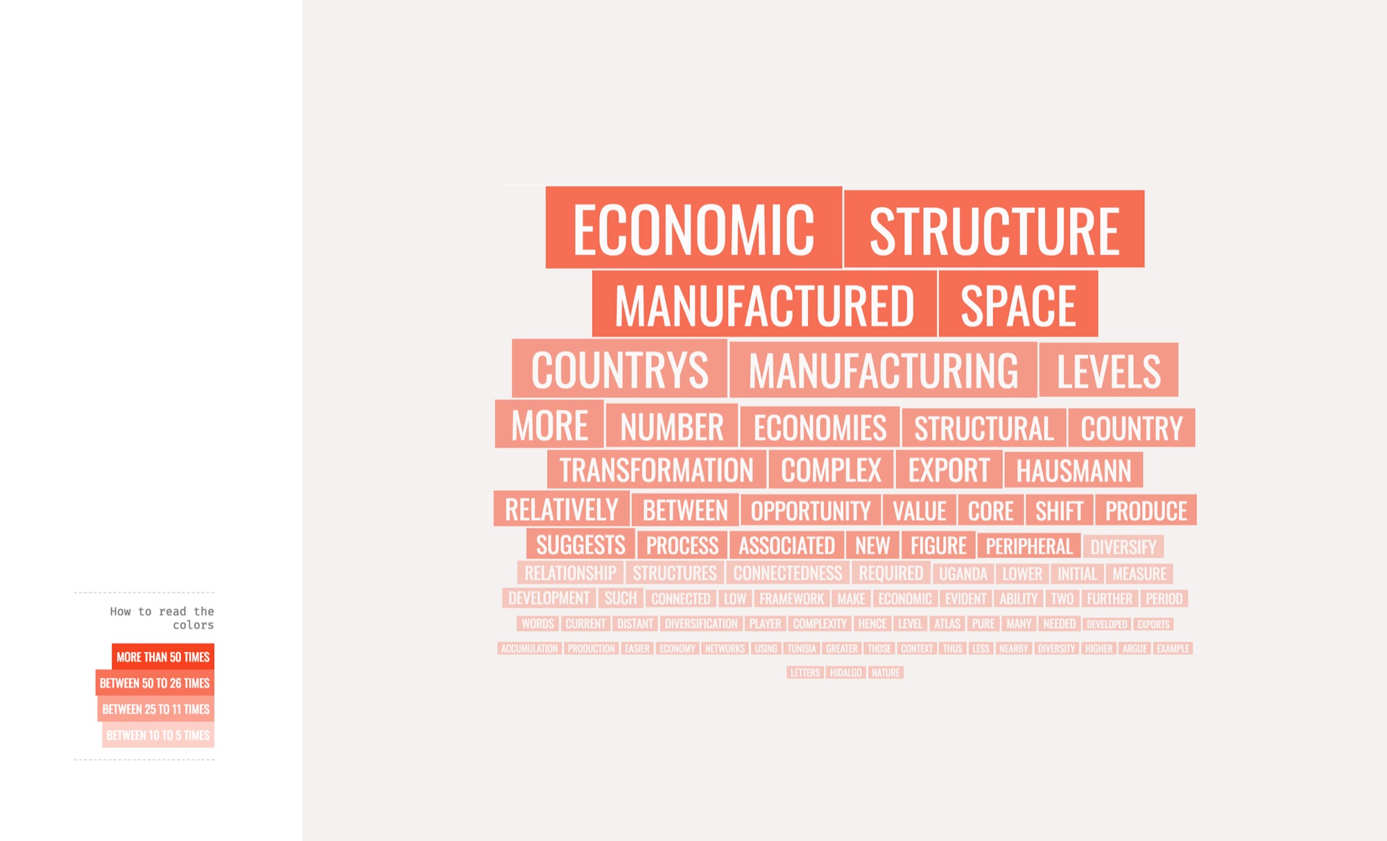 Each word in these word bubbles was sized to its frequency in each paragraph. Their colors show in which range they fall. Common words such as pronouns and articles, and also years/reference numbers, were removed with Javascript. The visualization was rendered with D3.