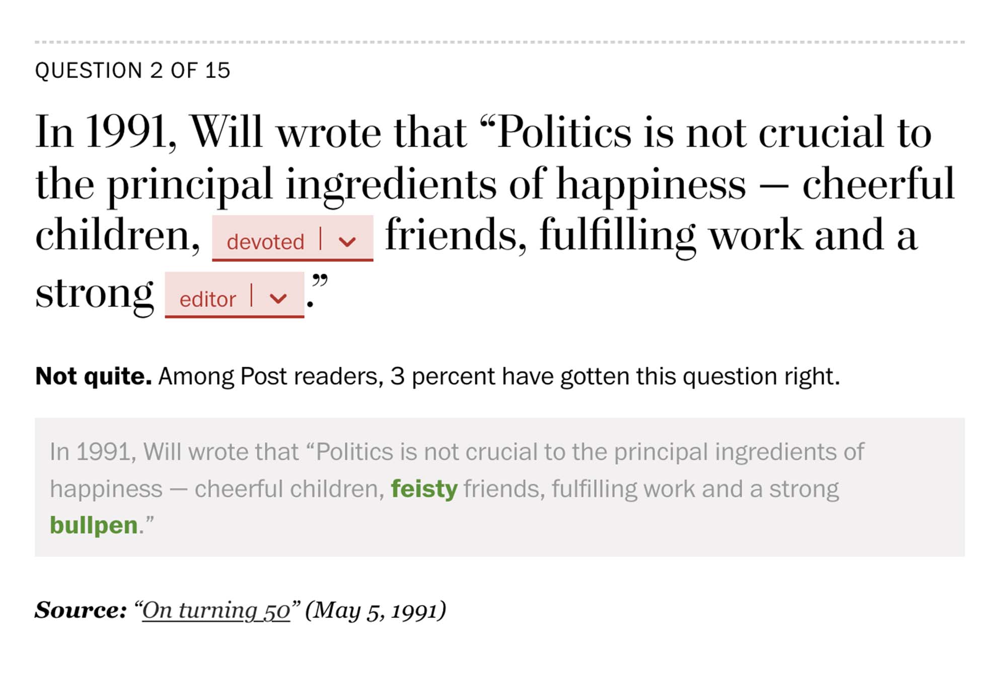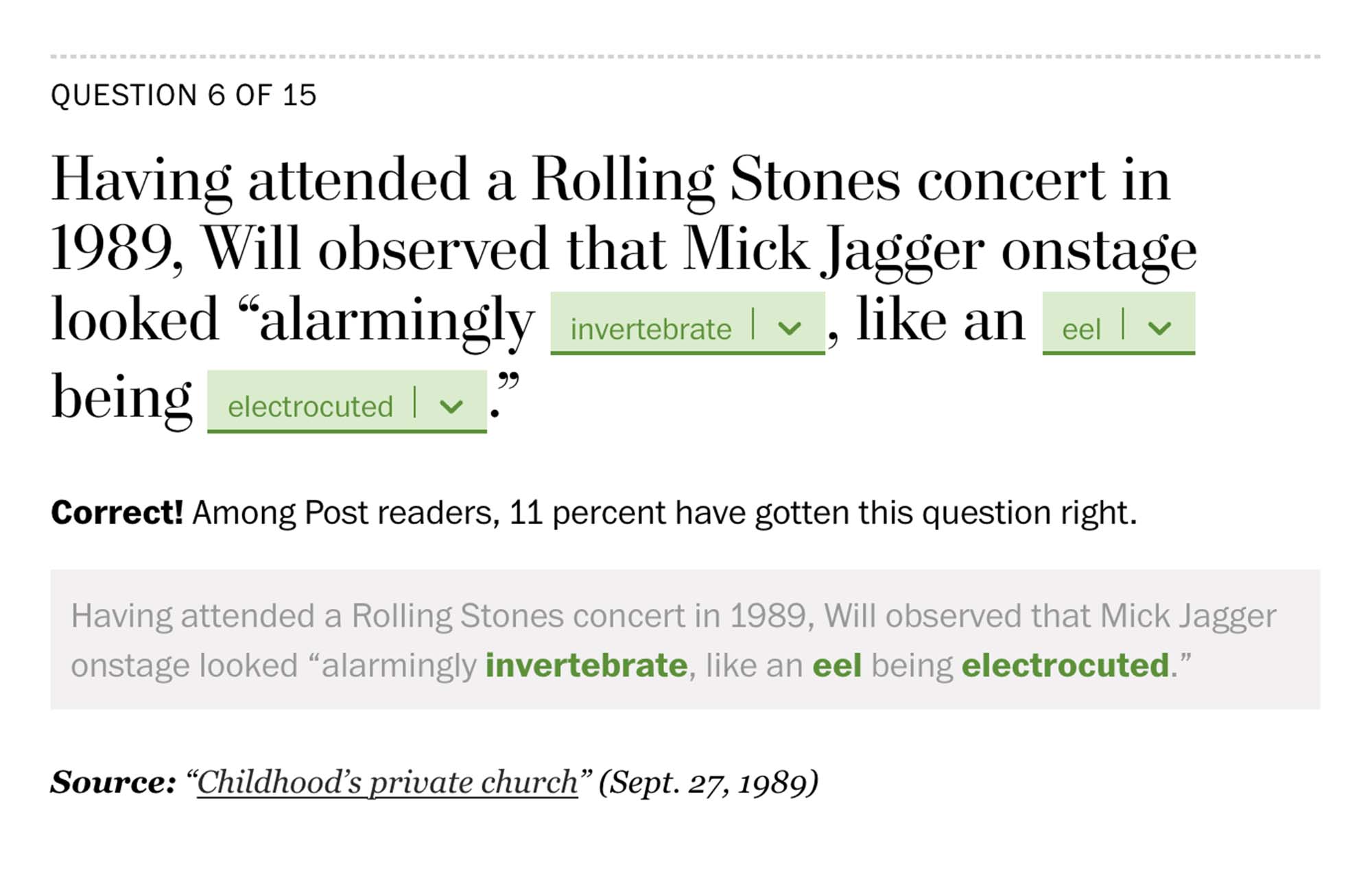 Working on top of the WaPo quiz template, I coded and designed some custom UI/UX components as madlibs/dropdowns inside some of the questions – I also created an animation on top of some of the quirkiest words used by Will on those quotes.